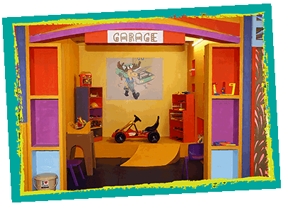 - This thematic auto hub houses all the required parts of a car, spread around, for kids to fix a car.
